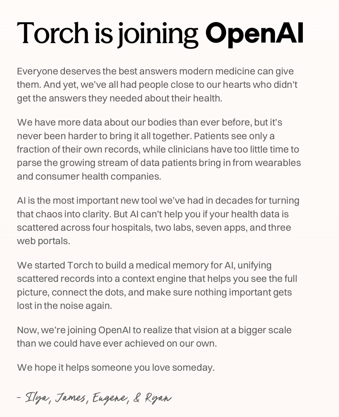 Torch在声明中解释称,其创立初衷是解决健康信息碎片化问题,通过构建“统一医疗记忆”系统,帮助用户全面了解健康状况。“而加入OpenAI,正是是为了在更大规模上实现这一愿景,最终惠及更多患者及其所爱之人”。
