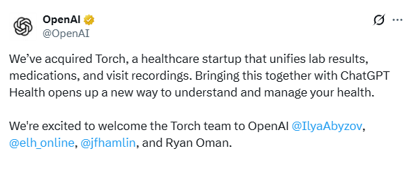 当地时间1月12日,OpenAI公司对外正式宣布收购初创的医疗保健技术公司Torch,而该笔交易估值高达1亿美元。